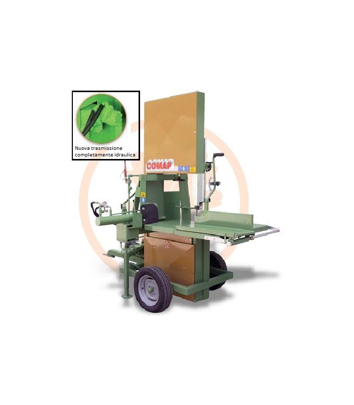Nuova trasmissione completamente idraulica. Le seghe a nastro Comap con spaccalegna trasversale si caratterizzano per la maggior distanza fra la lama e il montante della macchina favorendo misure di taglio molto elevate. Lo spaccalegna lavora da destra verso sinistra favorendo una migliore e sicura evacuazione del materiale che non deve essere spaccato. Tre modelli che si differenziano fra loro per la potenza dello spaccalegna e il diametro dei volani.